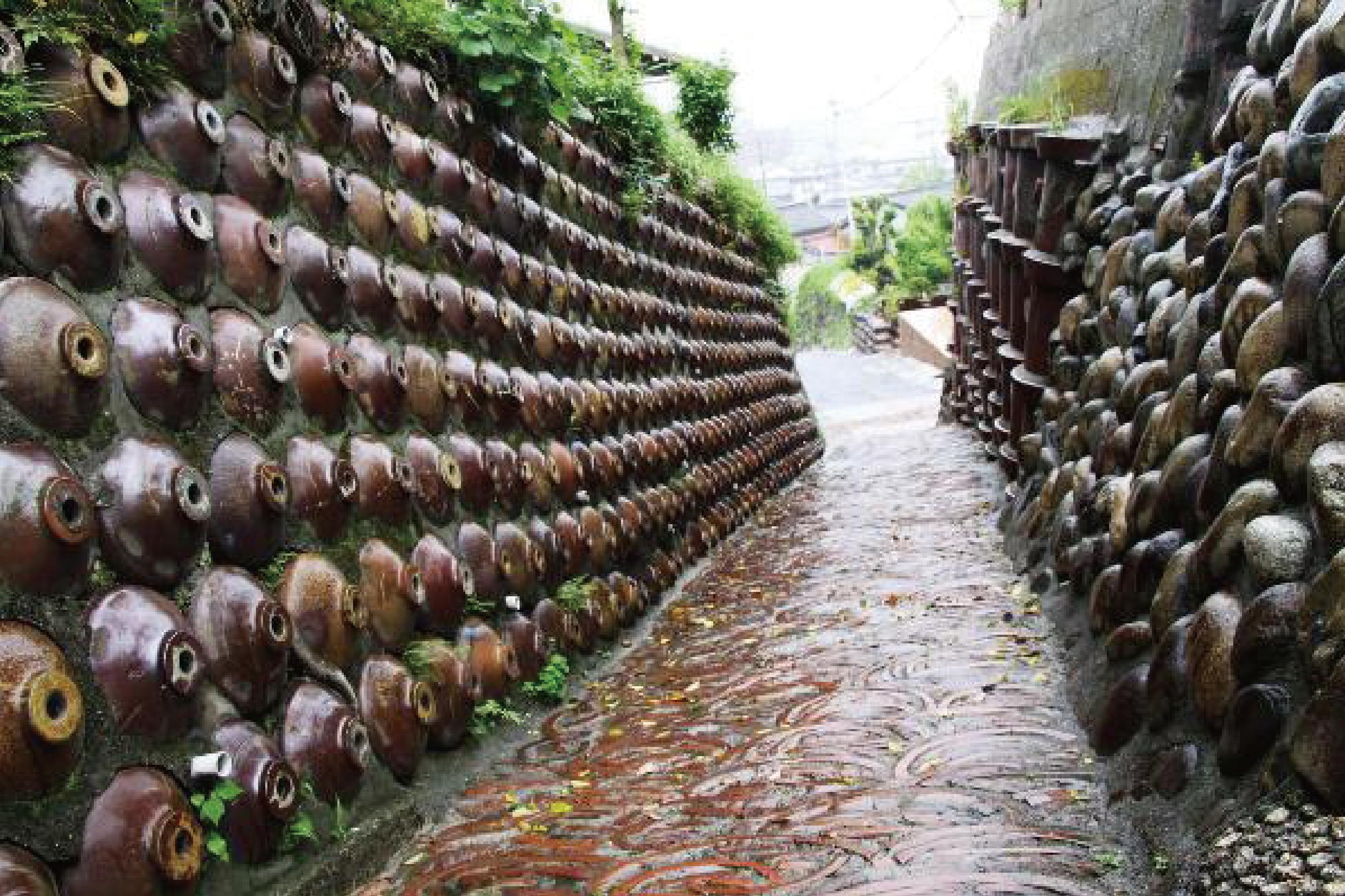 在自行散策的第一日,莫名地走入常滑的小丘巷內,高度似鶯歌尖山堆,正當以為迷路時,眼前幾間民宅每戶都放置四個大瓦斯桶,屋頂接著一支煙囪,原來都是小小的窯場工作室。街上都是用早期製作的陶水管(直筒)、陶電纜管(長方形六孔洞),這些日本早期的工業陶製品,在鶯歌新旺集瓷後巷的吳泉記工廠舊址(現 新益源),也看得到它的幾近一模一樣的製品;路邊的角窯煙囪也都留存下來。