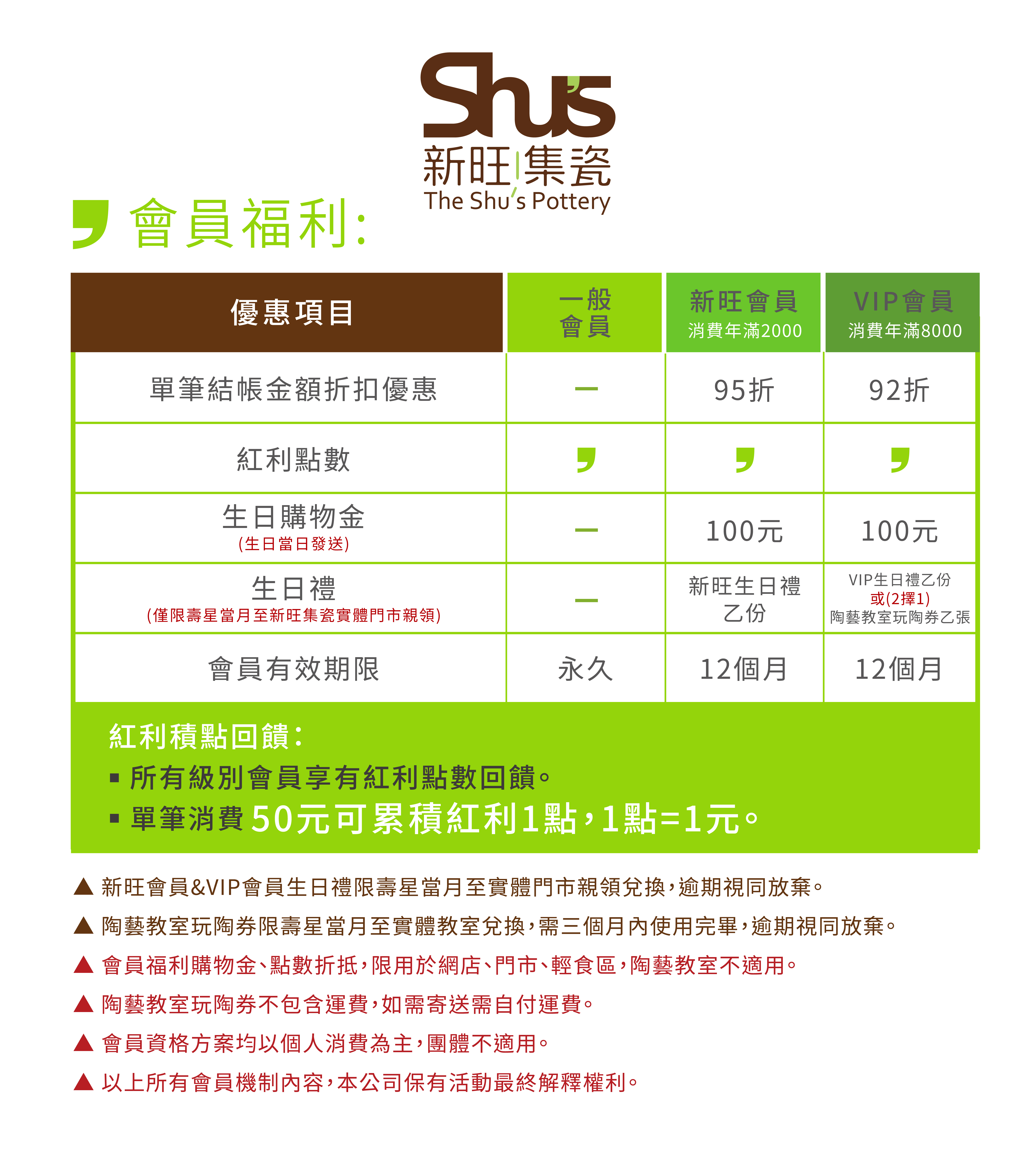 新旺會員&VIP會員有年度累積之條件限制,若需續會,則需遵照上述之會員消費條件,方可在下年度繼續享有優惠。