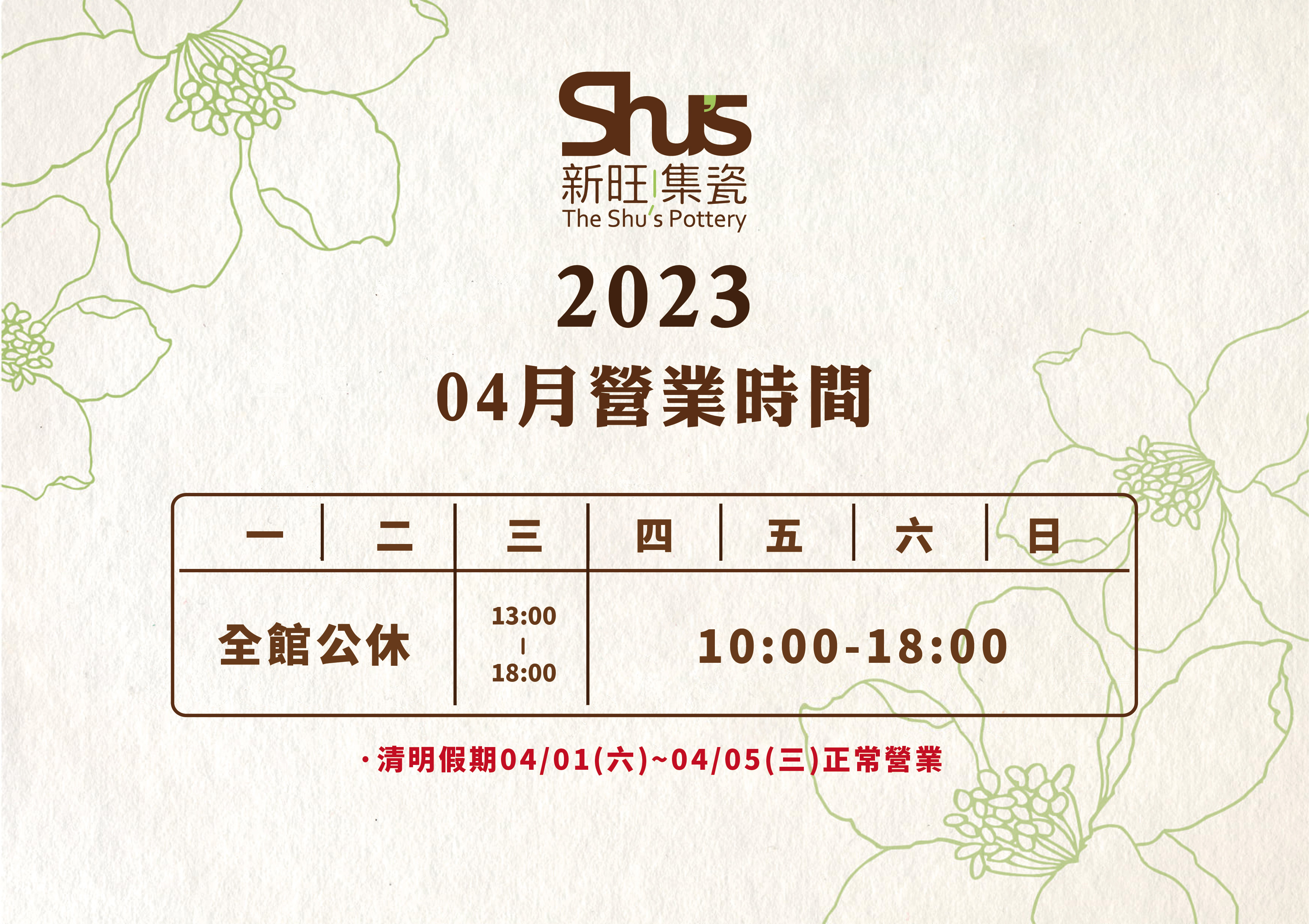 新旺|集瓷 2023.04月份營業時間