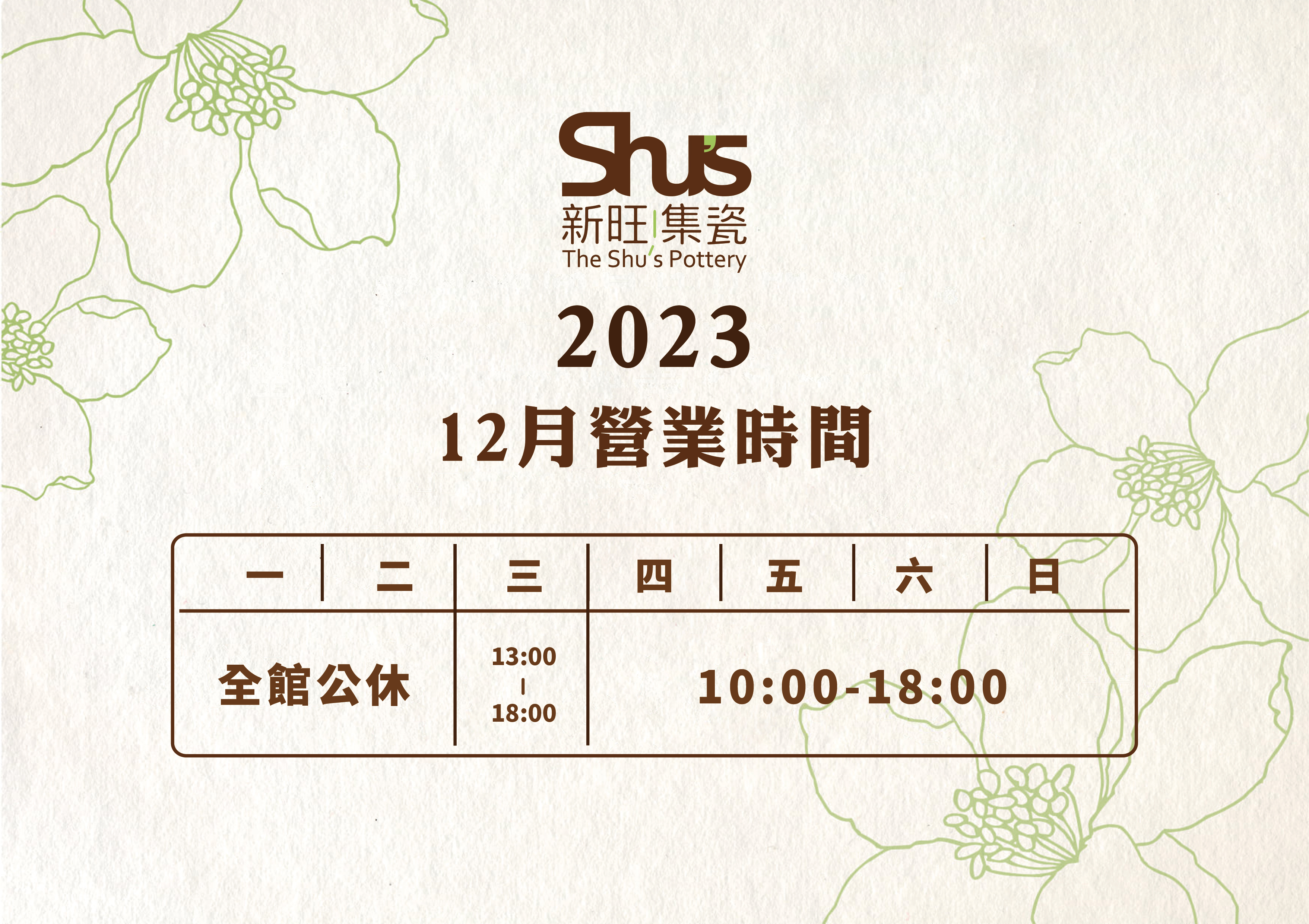 新旺|集瓷 2023.12月份營業時間