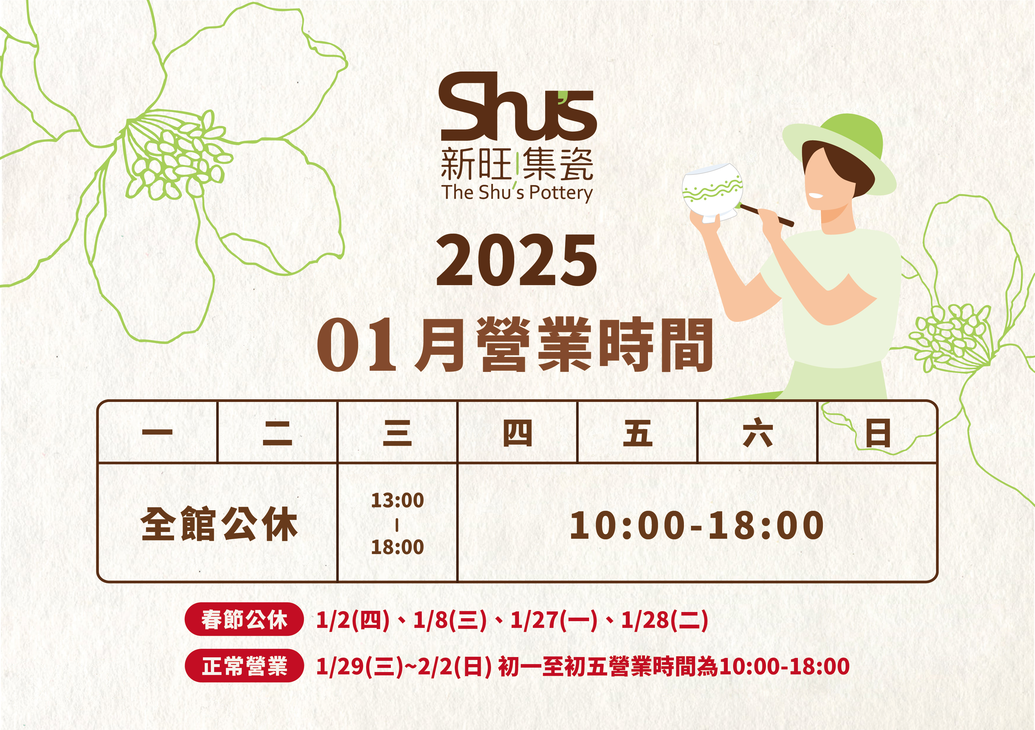 1/29~2/2 (初一至初五)【春節正常營業】10:00~18:00