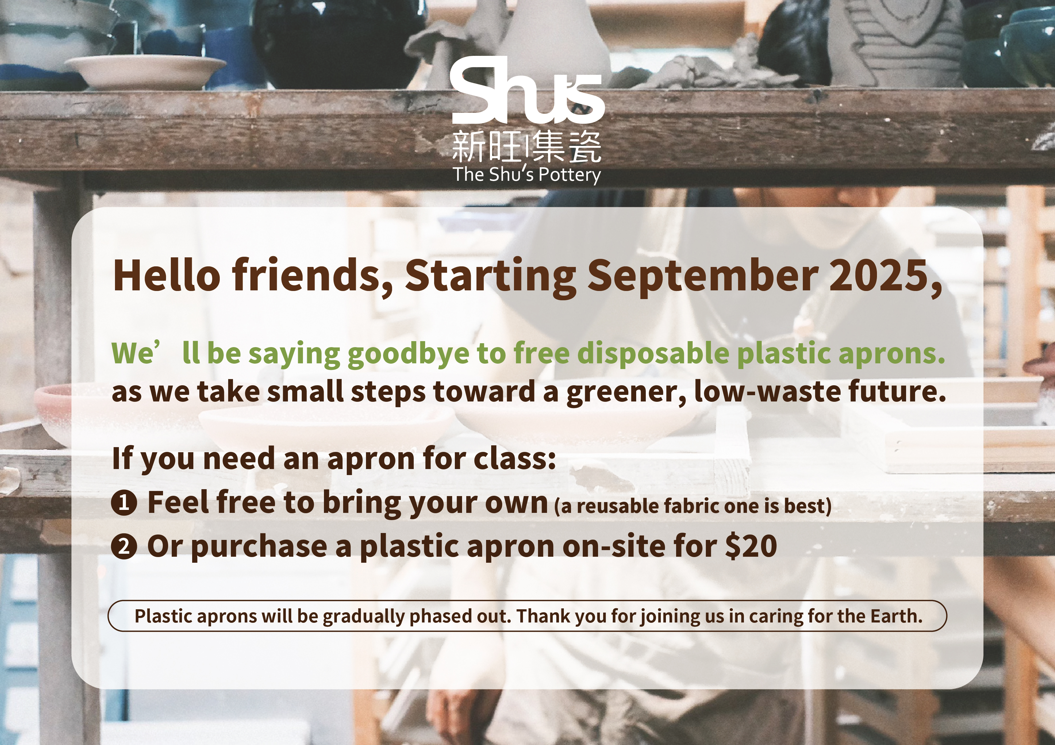 🌱 Plastic aprons will be gradually phased out.